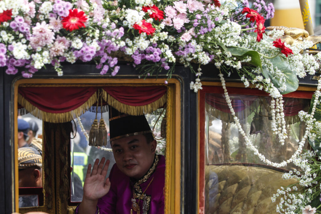 KGPAA Hamangkunegoro Sudibyo Rajaputra Narendra Mataram ya Gusti Puruboyo nyapa aruh masyarakat saka sanjerone rata ing prosesi kirab sawise winisudha minangka Kanjeng Susuhunan Pakubuwono XIV ing Kraton Surakarta, Solo, Setu (15/11/2025).