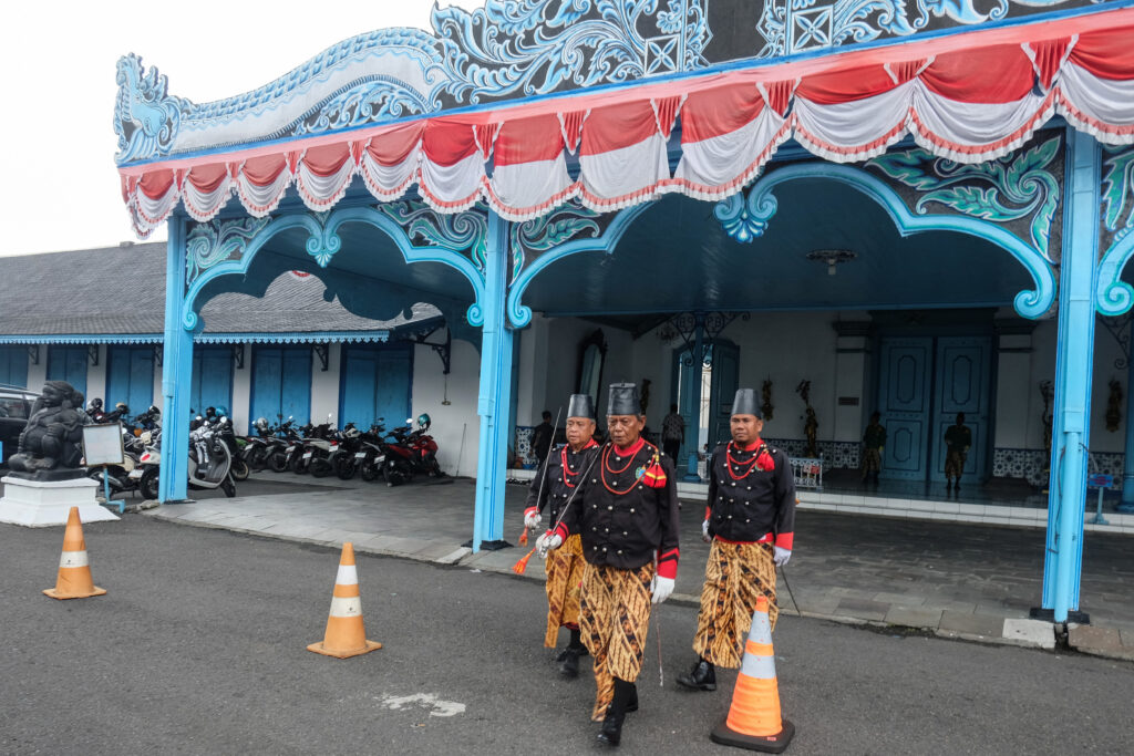 Prajurit abdi dalem Kraton Solo samapta ngreksa katentreman ing dina jumenengan Pakubuwono XIV.