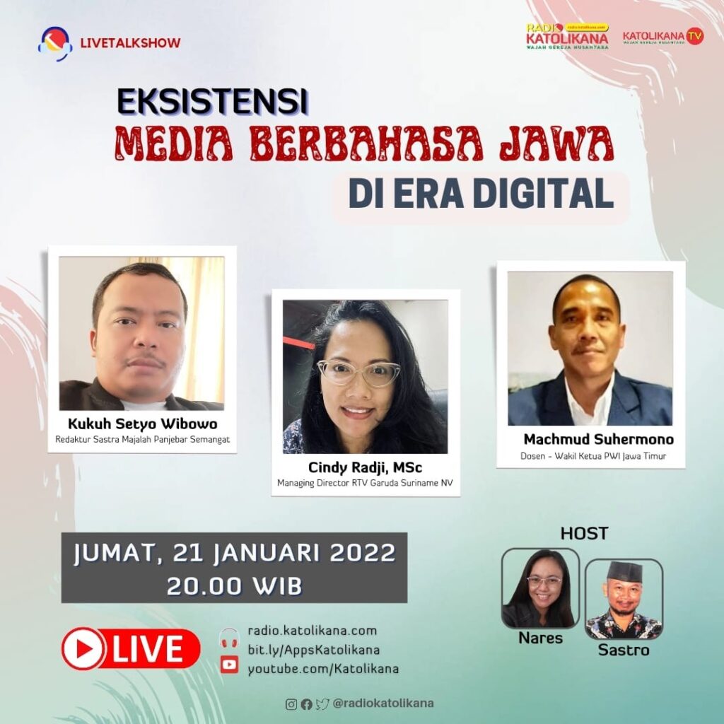 “Sing genah malih ora bisa sapatemon fisik,” ujare Cindy nalika dhiskusi virtual kanthi tema Eksistensi Media Berbahasa Jawa Di Era Digital kang dianakake dening Radio Katolikana, Jumuah bengi (21/1). Kejaba Cindy Radji, dhiskusi daring mau uga ngundang Kukuh S.W saka Panjebar Semangat lan Wakil Ketua PWI Jawa Timur Mahmud Suhermono minangka pemateri.