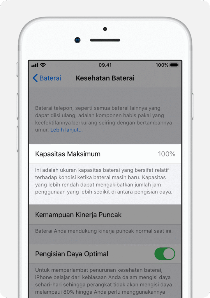 Kondisi 100% nyatakake yen kesehatan batrei iPhonemu prima banget. Yen kondisi batrei sangisore 80%, tandhane batrei iPhonemu wis ora sehat.