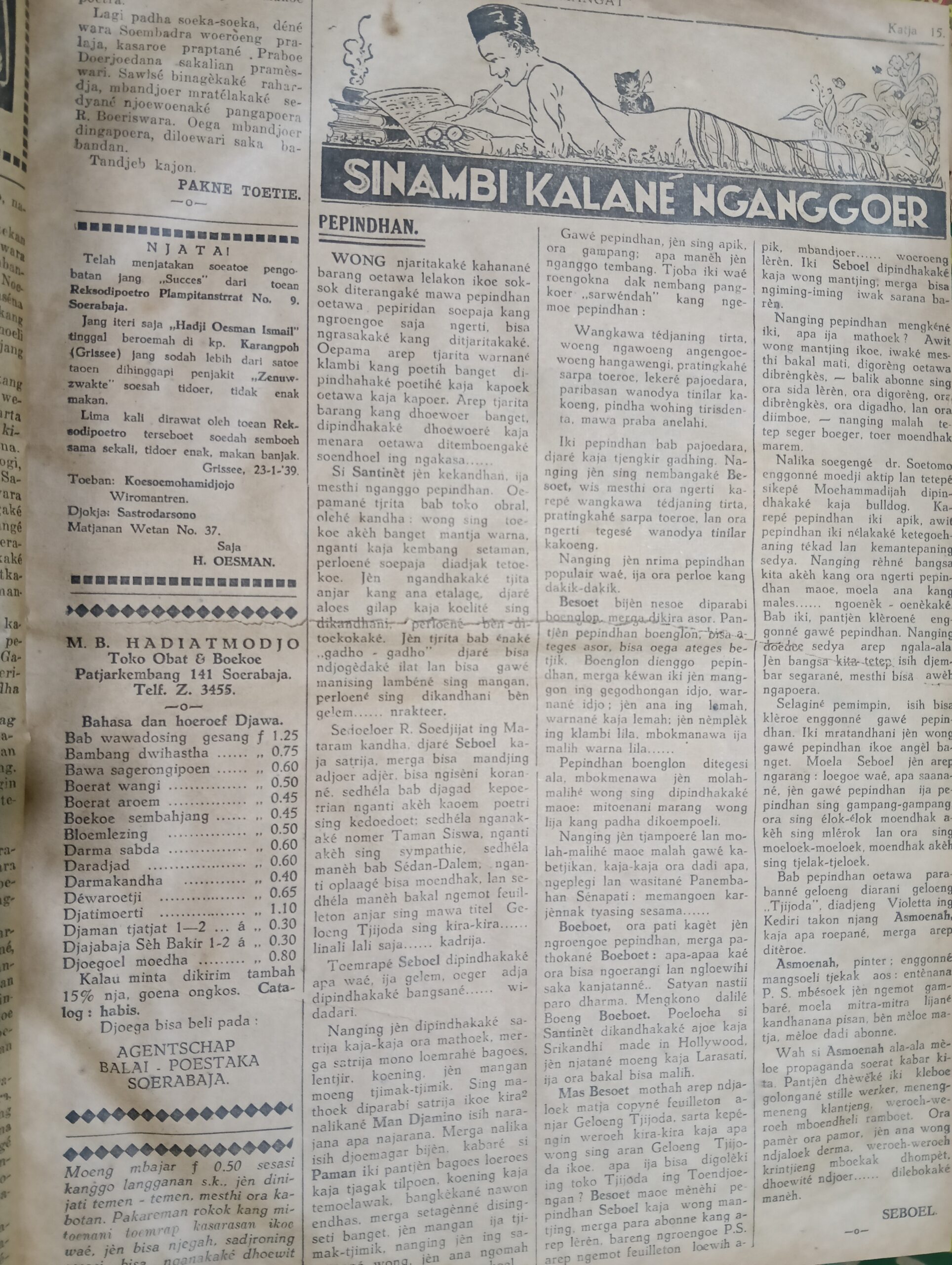 ….Santinet ja setali tiga oeang, sami mawon, sing diarep arep doedoe taoen anjar, nanging sasi anjar, soepaja enggal bisa sesandjan mitra-mitrane, awit gelange wis bisa diteboes maneh. Beda jen tanggal toewa, ora wani leloengan, merga tangane ngliga, koepinge soewoeng, moelane moeng ana ing omah wae, nek ditakoni Asmoenah, geneja kok anteng apa wis njantri dadi sripah? Wangsoelane: Anoe joe, akoe isih lara sirahkoe pileg……