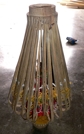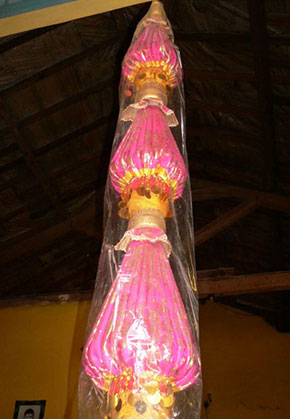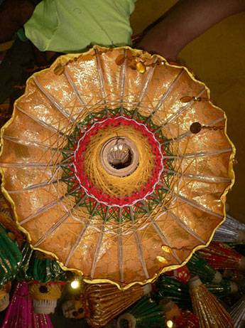 “Dene bentuk payung hias kembang maneka warna, ana ijo, kuning, abang lan perak. Yen warna emas pancen katon eksklusif, uga bahanne ya luwih larang, uga luwih awet bisa nganti setaun tanpa udhar” imbuhe.