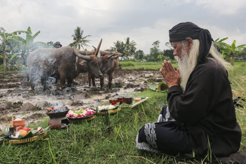 Saweneh pinisepuh ngunjukake donga pamuji jrone prosesi ritual adat Labuh Sawah (Megawe) ing Bulak Kenari, Kregolan, Margomulyo, Seyegan, Kabupaten Sleman, Daerah Istimewa Yogyakarta, Selasa (16/9/2025). Upacara adat minangka pratandha kawiwitane pangolahan lahan sadurunge nandur pari kang digelar dening Majelis Luhur Kepercayaan Indonesia (MLKI) lan Lembaga Sri Tumuwuh iku dadi upaya pelestarian tradhisi tetanen para leluhur, sarta mikuwati kesadharan masyarakat ngenani wigatine njaga harmoni antarane manungsa karo alam. (Foto: Antara/Andreas Fitri Atmoko/rwa)