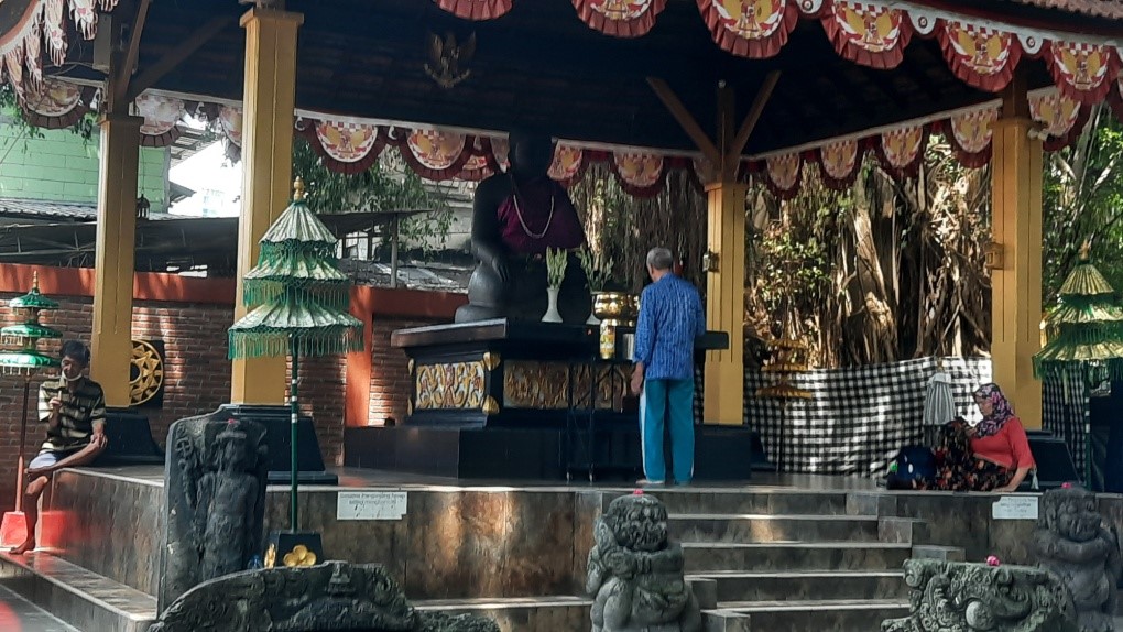Ganda wangi kutug hio nyogrok irung sanjeroning area situs purbakala reca Jaka Dholog (ing papan jenenge katulis Joko Dolog), Jalan Taman Apsari, Surabaya, Jawa Timur, Rebo awan, 9 April 2025. Ana priya telu lan wanita siji sing katemben manekung. Siji ing antarane priya kuwi katon khusuk sembahyang kanthi nemplelake dupa ing bathuke kanthi posisi ngadeg.