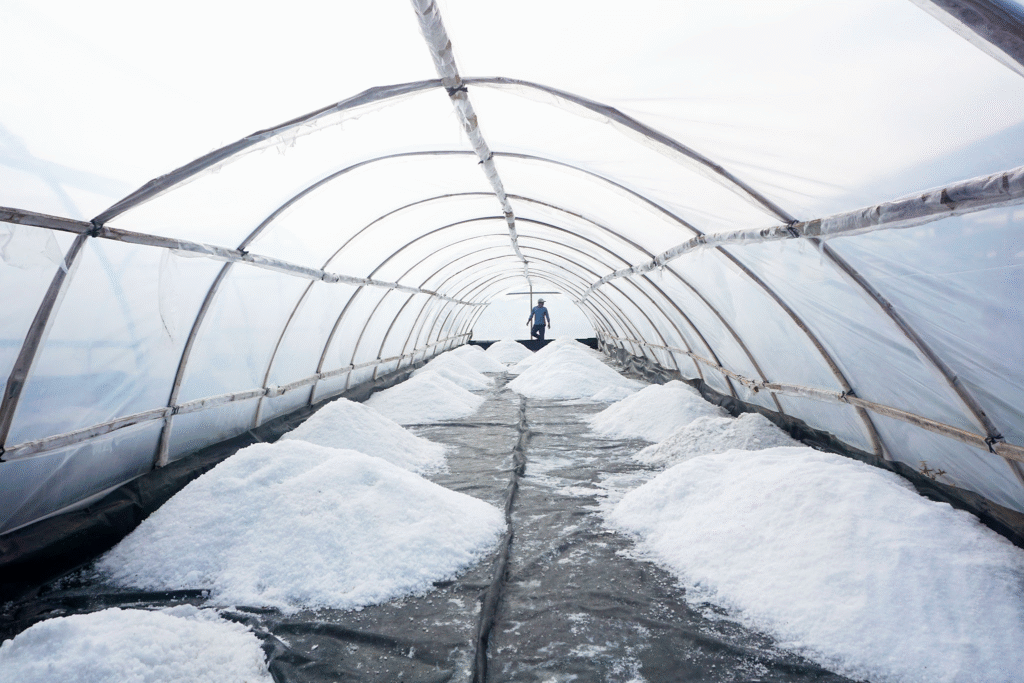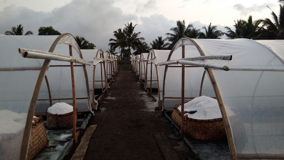KATON bangunan seka pring kang wujude mlengkung setengah lingkaran kang ditutupi plastik, dheret dheret pirang pirang ing papan amba, ora adoh seka Segara Kidul, kurang luwih 500 meter. Sarehne katon sepi ora ketemu pawongan, penulis banjur bali tumuju Tunnel Garam Wisata Edukasi Garam Desa Tlogopragoto.