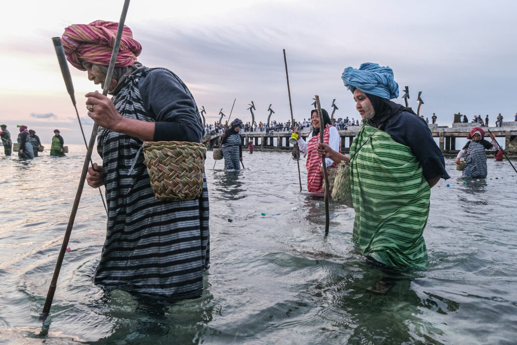 Sawatara wanita Wakatobi, Sulawesi Tenggara, golek iwak kanthi cara ditumbak nalika banyu samodra lagi surut, awal Oktober 2025. Atraksi Hekente mau klebu rerangkening Festival Wowine Wakatobi, kegiyatan kang nyimbulake wanita tanggon lan mandhiri jrone nguripi anak-anake. Festival mau uga diregengake pentas seni kaya tradhisional, antara liyta prosesi Kasoda’a lan Hekente. (Foto Antara/Andry Denisah)